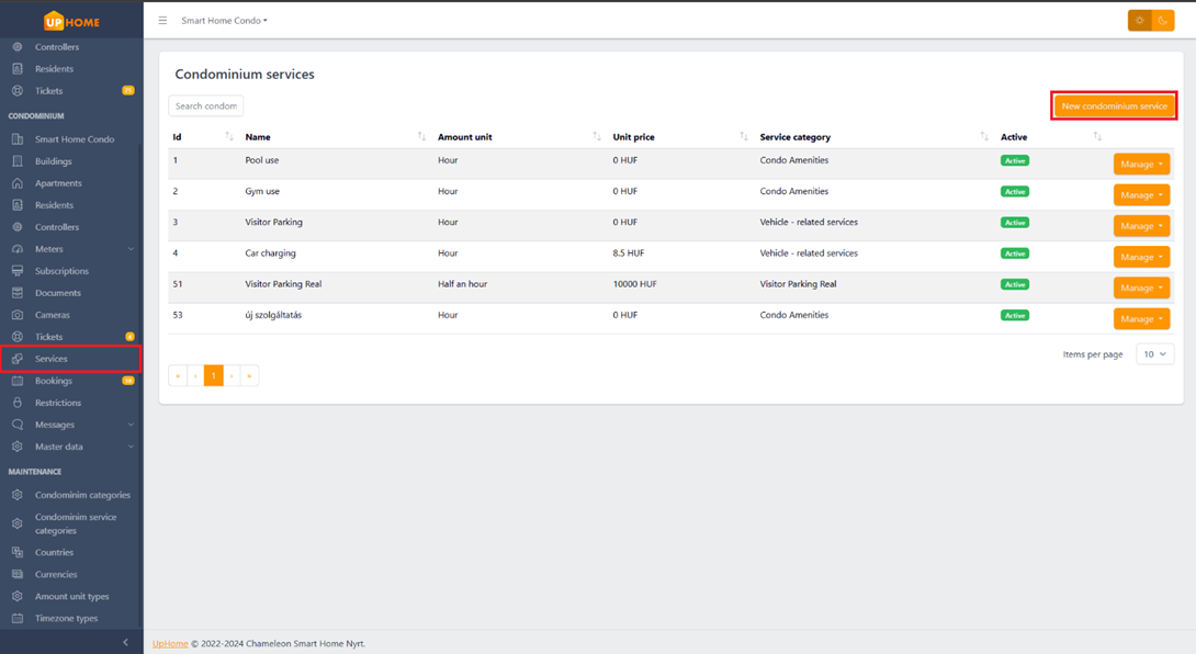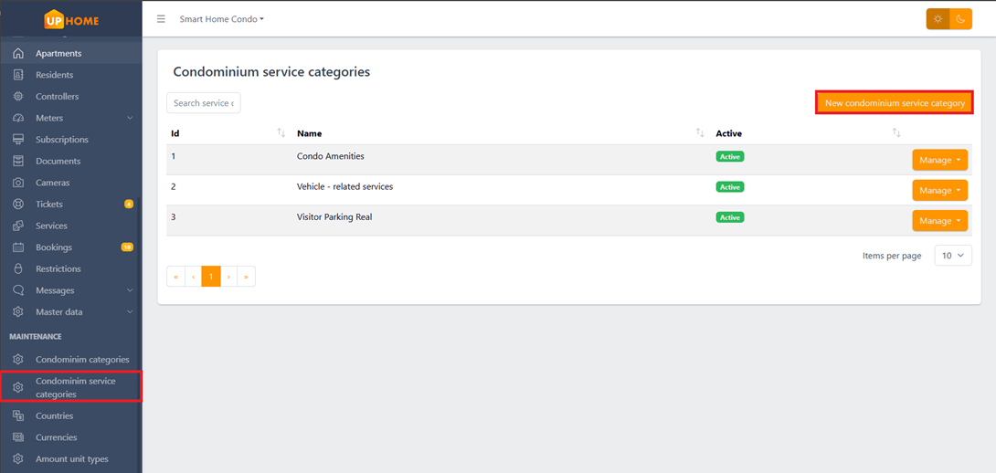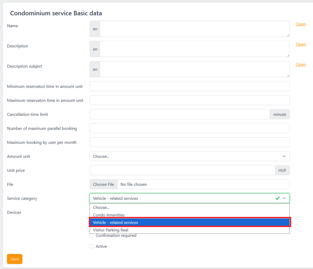 Először hozzunk létre egy új „Condominium Service Category” (Lakópark szolgáltatási kategória) elemet.