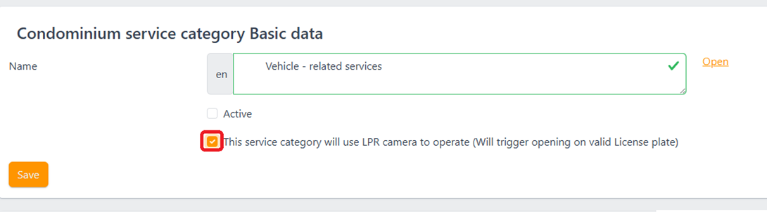 Töltsük ki a szükséges mezőket és pipáljuk ki az opciót: „This service category will use LPR camera to operate (Will trigger opening on valid license plate)” (Ez a szolgáltatási kategória LPR kamerát használ – érvényes rendszám esetén nyitást indít.)