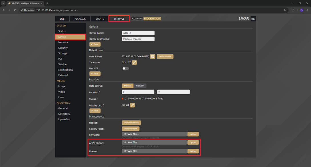 Itt tallózuk be és aktiváljuk a szükséges licenceket ALPR motorhoz (rendszámfelismerés) és kamerához is.