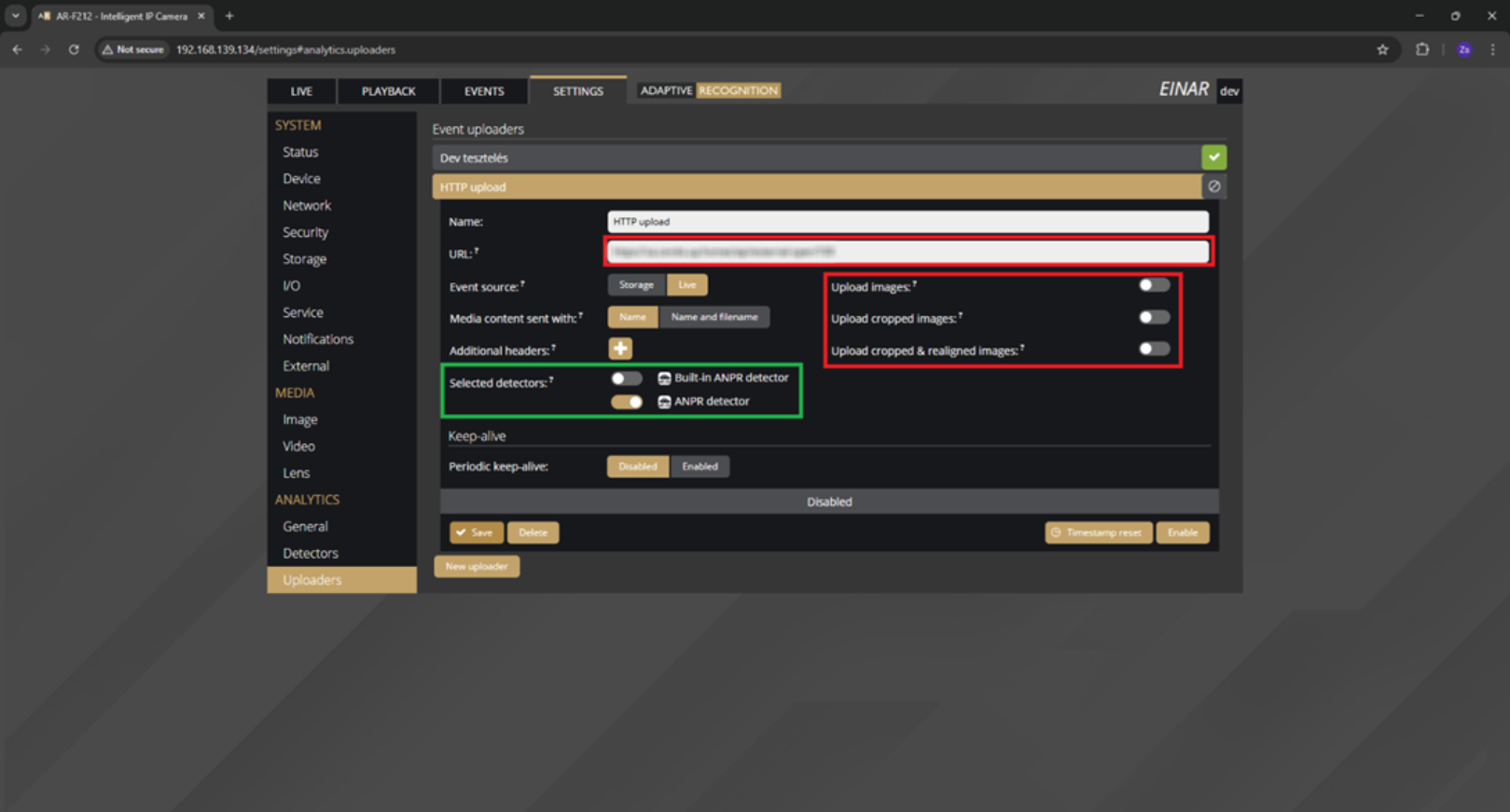 Másoljuk be az URL helyére a „License Plate Recognition Camera URL” értékét. Itt megváltoztathatjuk a treshold (felismerési biztonság) értékét. Az alapérték ami a kimásolt URL-ben van az a minimum lehetséges értéke ennek, e fölé javasolt állítani. Kapcsoljuk ki az összes kép-feltöltési funkciót. Állítsuk be a detektorokat igény szerint, majd mentsük el a beállításokat.