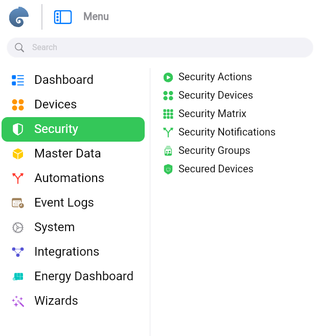 A beléptető rendszerek beállítása több lépéses. Fel kell venni a biztonságtechnikai eszközöket a rendszerbe, azokat portokhoz rendelni, felvenni a jogosultsági köröket, felvenni a felhasználókat és jogosultsági körökhöz rendelni őket, felvenni azokat a műveleteket, amit végre szeretnénk hajtani ha egy arra jogosult személy megfelelően használja a rendszert. A Security-t a Menü alatt találjuk.